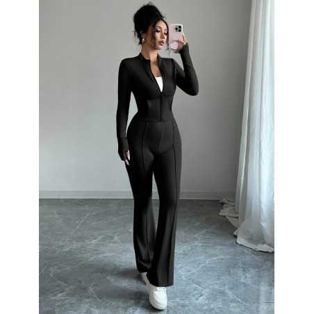 Descoperă compleul damă elegant 2 piese, perfect pentru femeile care vor să îmbine stilul modern cu confortul zilnic. Setul este format din bluză tip jachetă cu fermoar și pantaloni lungi cu croială cambrată, evidențiind silueta și oferind un look sofisticat și actual.