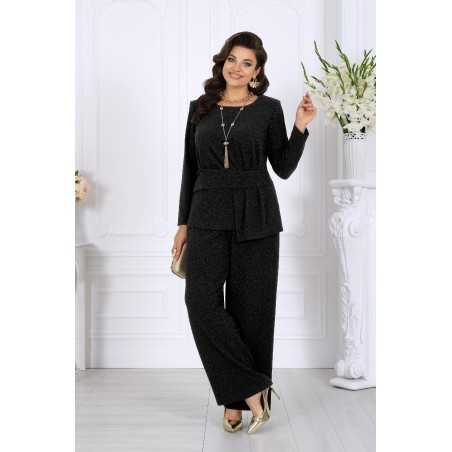 Descoperiți eleganța și strălucirea cu acest compleu de damă compus din bluză și pantaloni, perfect pentru a vă scoate în evidență la orice eveniment special sau petrecere. Confecționat dintr-un material tip lurex în nuanțe de negru sau gri închis, cu sclipiri discrete, acest ansamblu oferă un look sofisticat și modern.