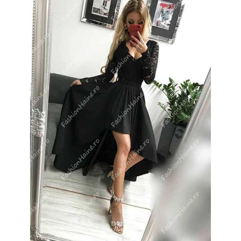 Rochia Tara este combinația perfectă între eleganță și stil modern! Cu un croi asimetric ce evidențiază silueta, această rochie îți oferă un look spectaculos la orice eveniment special. Bustul este decorat cu dantelă fină, adăugând un plus de rafinament, iar mânecile lungi transparente completează perfect designul. Fusta lejeră, mai scurtă în față și mai lungă în spate, creează un efect diafan și sofisticat.